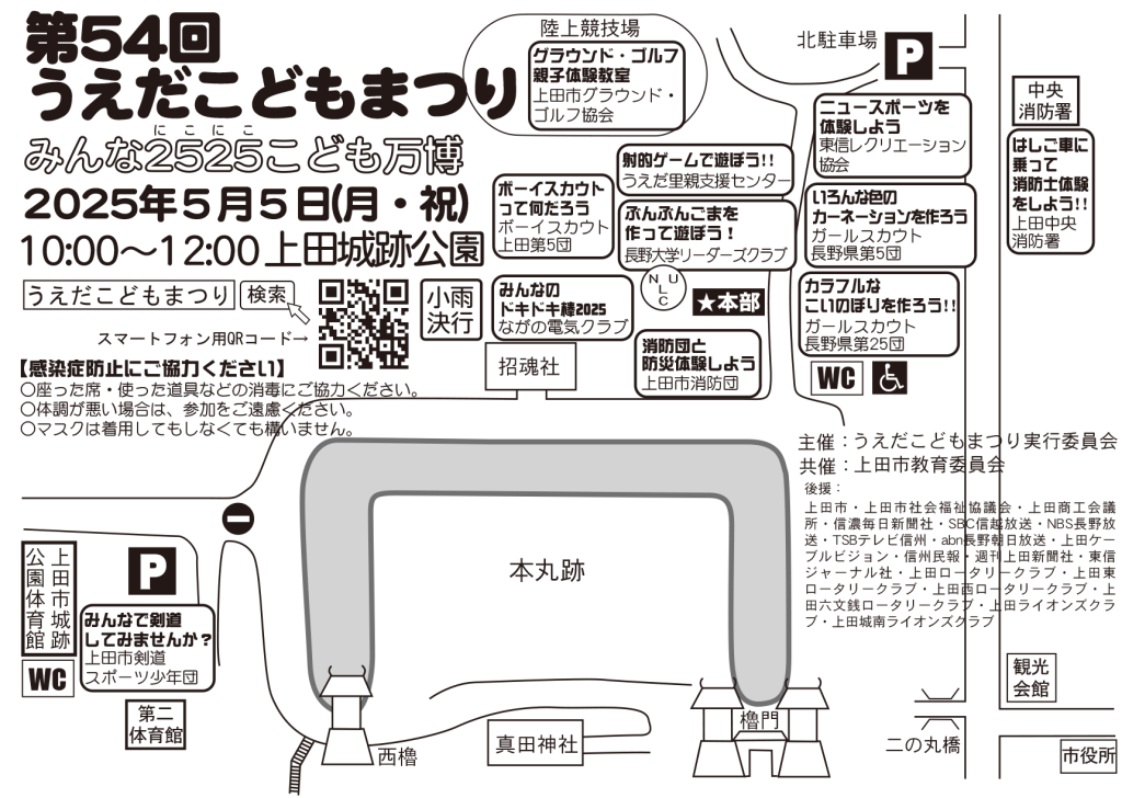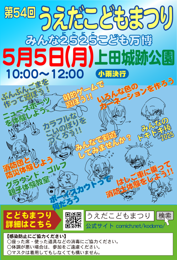 第54回うえだこどもまつりは2025年5月5日(月・こどもの日)に開催! Twitter Facebook はてブ Pocket LINE コピー 2025.04.16 第54回うえだこどもまつりは、2025年5月5日(月・祝)に、上田城跡公園一帯で開催します!みなさん遊びに来てください。●日時:2025年5月5日(月・こどもの日) 10:00~12:00●会場:長野県上田市・上田城跡公園(憩いの広場、陸上競技場、市民体育館、中央消防署)小雨決行(大雨の場合は中止)